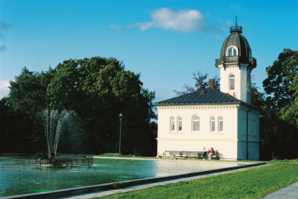 Captured from the top of St. Hanshaugen Park in Oslo, this 35mm photograph celebrates the quiet magic of a northern summer day. The fountain and tower house stand as the scene’s anchors, framed by rich greenery and a soft blue sky. Two women sit chatting on a bench in front of the tower house—one in a red shirt, the other in white—adding a gentle human rhythm to the landscape.